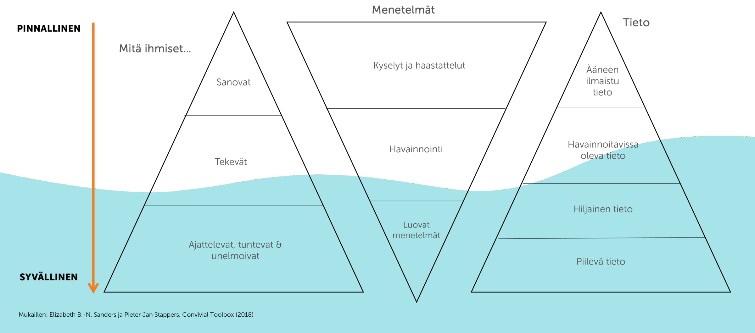 Elizabeth Sanders on kuvannut tutkimuksissaan, että asiakasymmärrystä tulisi kerätä yhdistämällä menetelmiä, jotka perustuvat ihmisten sanomiseen, toimintaan ja luomiseen (say, do, make). Tällainen lähestymistapa mahdollistaa monipuolisemman ja syvällisemmän ymmärryksen asiakkaista kuin yksittäisen menetelmän käyttö. Oheinen kaavio kuvaa menetelmien kautta saatavan tiedon syvyyttä.