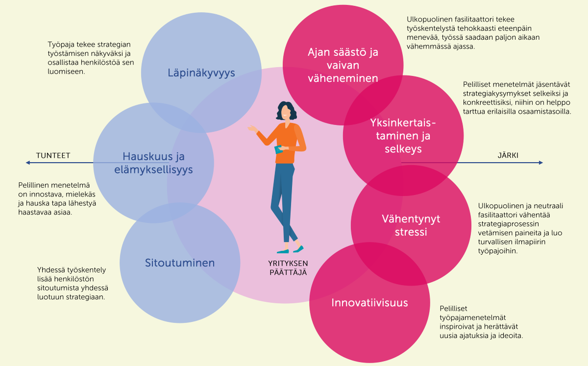 Pelillinen ja osallistava strategiatyöpaja tuotti yrityksille arvoa kahdella tasolla: tunnetasolla ja toiminnan tasolla. Oheisessa kuvassa nämä arvot jäsentyvät visuaalisesti yrityksen päättäjän ympärille – vasemmalle puolelle tunnepitoiset hyödyt ja oikealle puolelle strategiatyötä sujuvoittavat, järkeen perustuvat hyödyt.