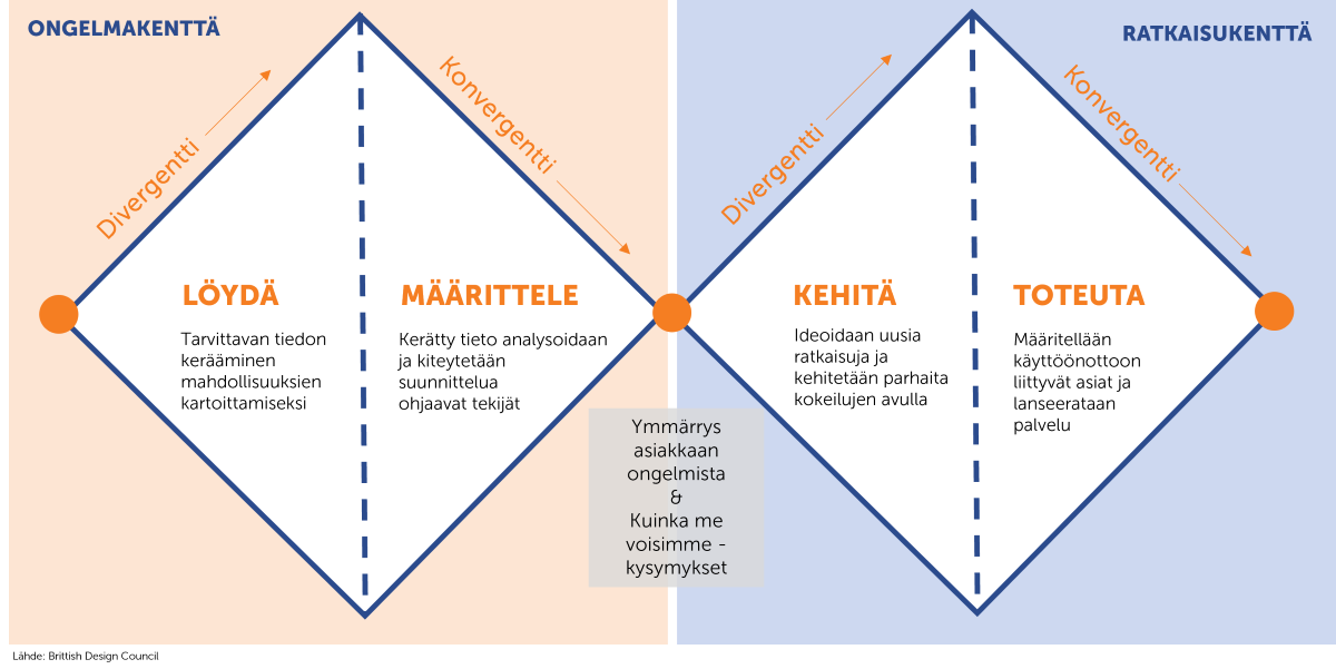 Esittelemme seuraavassa tuplatimantin pohjalta johdetun prosessimallin, jossa on kiinnitetty huomiota myös palvelumuotoiluprojektin tavoitteiden määrittelyyn ja resurssitehokkaampaan työskentelyyn. Kahden timantin sijaan mallissa on neljän timantin muodostama prosessi. Tämä tarkoittaa sitä, että mallissa on tunnistettu useampia divergentin ja konvergentin ajattelun paikkoja, eli luovan ja rationaalisen ajattelun vuorottelua.
