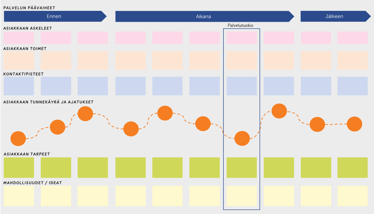 Palvelupolun päävaiheet (jaoteltuna usein ennen – aikana – jälkeen -vaiheisiin)